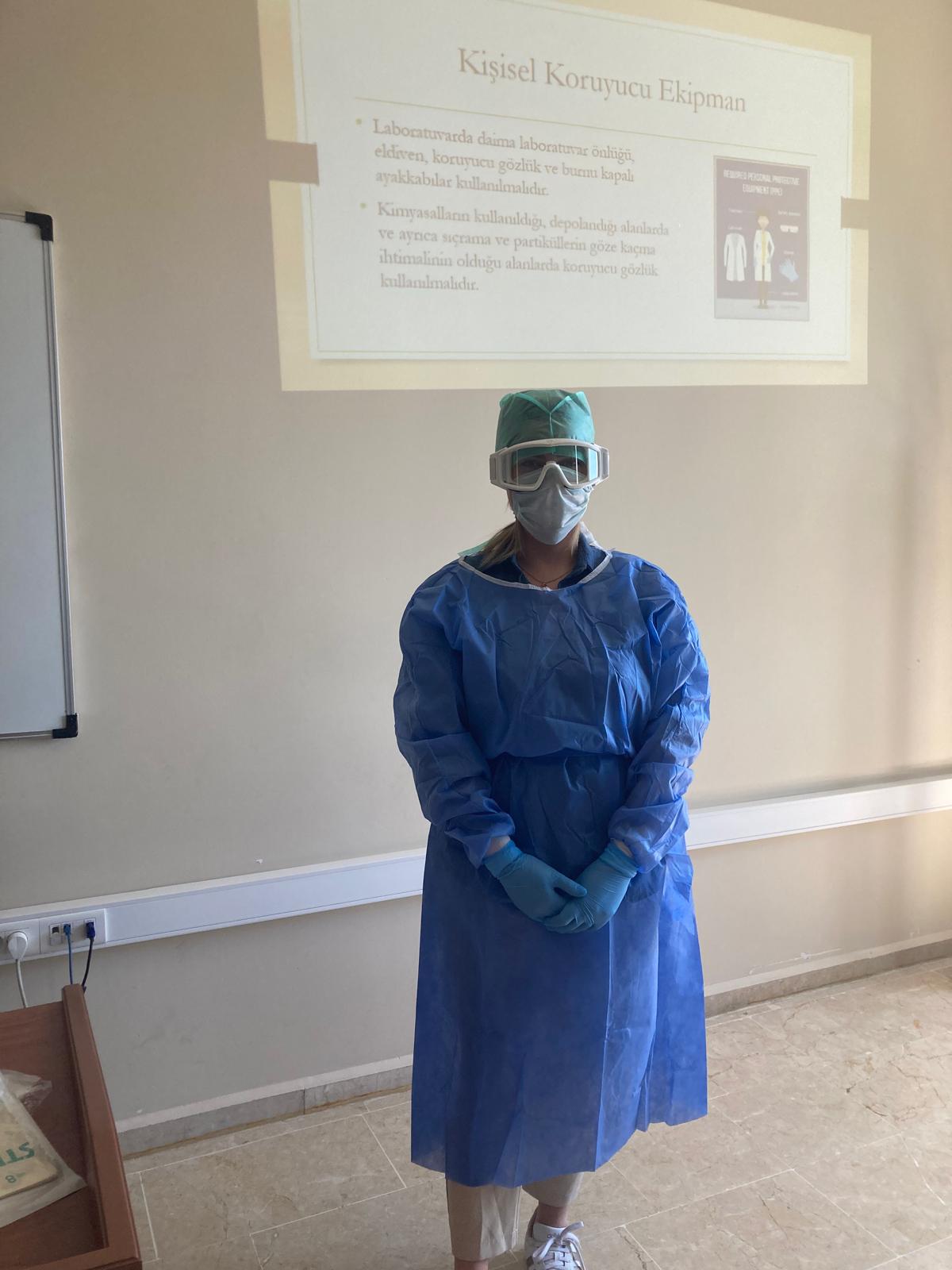 "2024-2025 Bahar Yarıyılı Eğitim-Öğretim Dönemi kapsamında yürütülen Laboratuvar Güvenliği dersi sırasında, kişisel koruyucu ekipmanların önemi anlatılırken bir öğrencimiz ekipman kullanımıyla ilgili görsel bir sunum gerçekleştirmiştir."